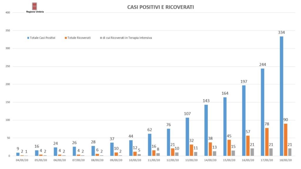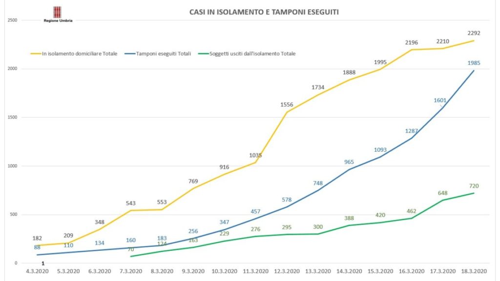 Dei 334 pazienti positivi 14 sono di fuori regione: nella provincia di Perugia i positivi sono 236 e 84 in quella di Terni: sono ricoverati in 90 (4 di questi sono di fuori regione), di cui 64 nell’ospedale di Perugia e 22 in quello di Terni. Dei 90 ricoverati, 21 sono in terapia intensiva, 10 nell’ospedale di Perugia e 11 in quello di Terni. Le persone in osservazione sono 2292: di questi, 1616 sono nella provincia di Perugia e 676 in quella di Terni. Nel complesso entro le ore 24 del 18 marzo, sono stati eseguiti 1985 tamponi. Sempre alla stessa data risultano 720 soggetti usciti dall’isolamento di cui 550 nella provincia di Perugia e 170 in quella di Terni.