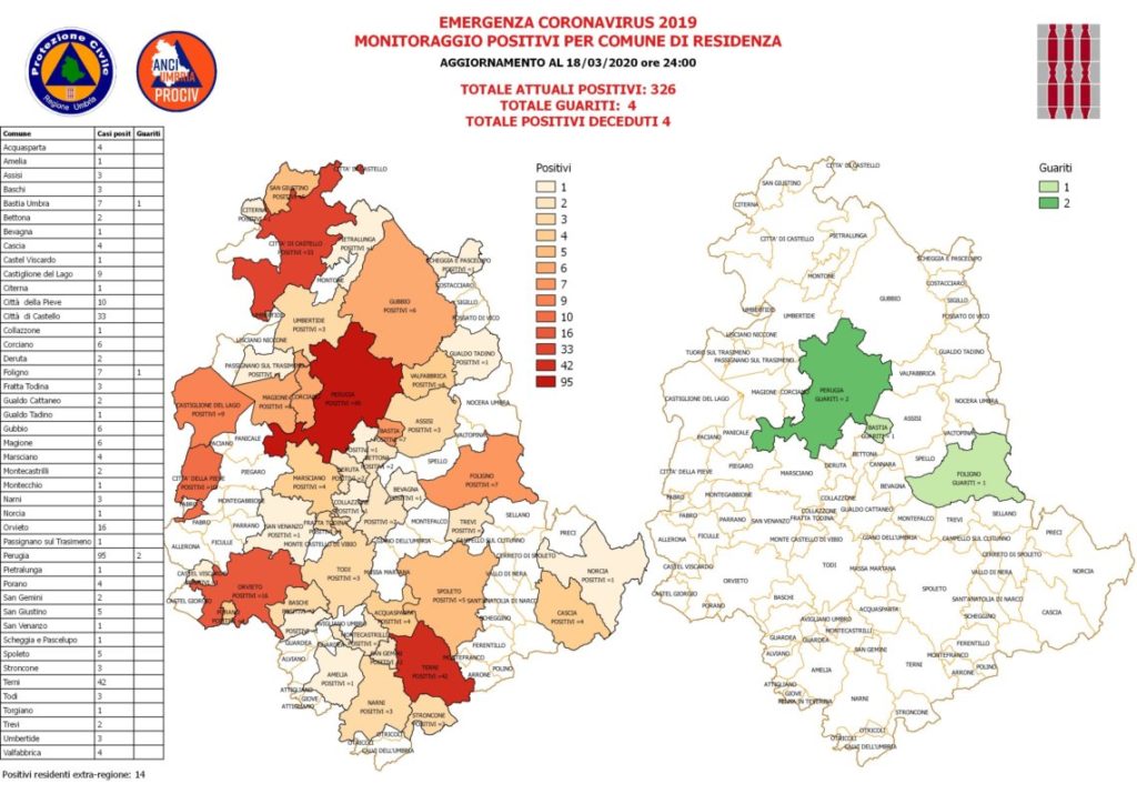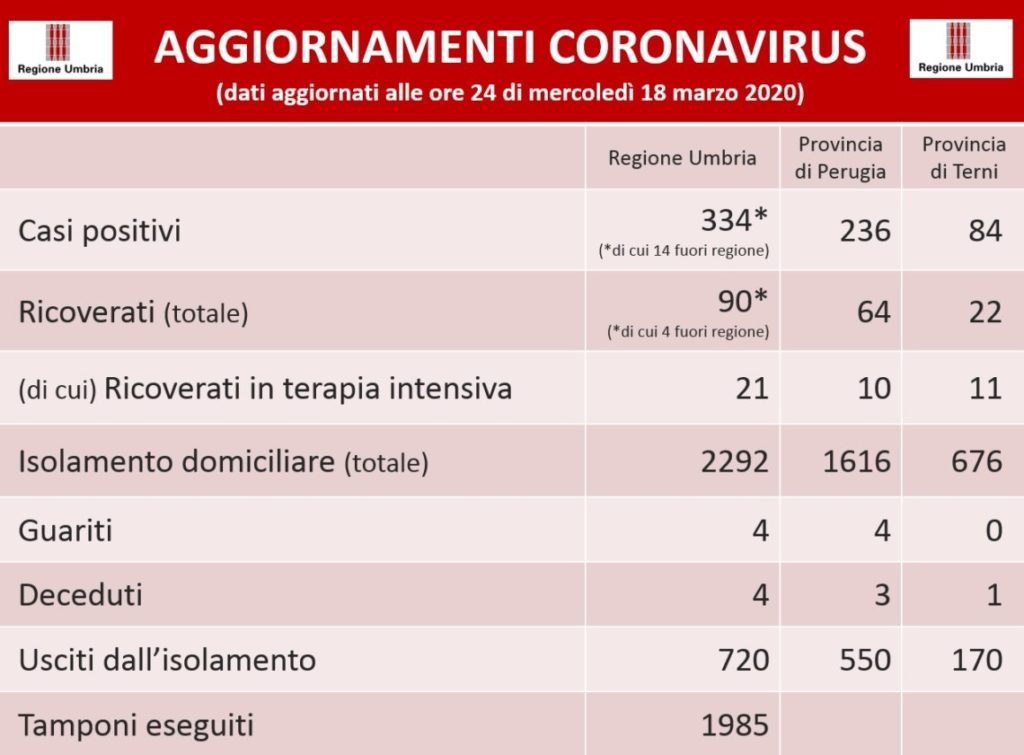 Sale a 4 il numero dei deceduti in Umbria in seguito all’infezione prodotta dal virus Covid-19. I primi due decessi sono stati registrati nei giorni scorsi – 1 nella provincia di Perugia e 1 nella provincia di Terni – ieri sono decedute altre due persone nella provincia di Perugia. Dai dati aggiornati alla mezzanotte del 18 marzo, 334 persone in Umbria risultano positive al virus, i guariti al momento restano 4.