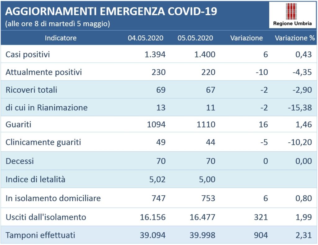 Questi i dati al momento disponibili e aggiornati alle ore 8 di martedì 5 maggio: complessivamente 1.400 persone (+6) in Umbria sono risultate positive al virus Covid-19, gli attualmente positivi sono 220 (- 10).
