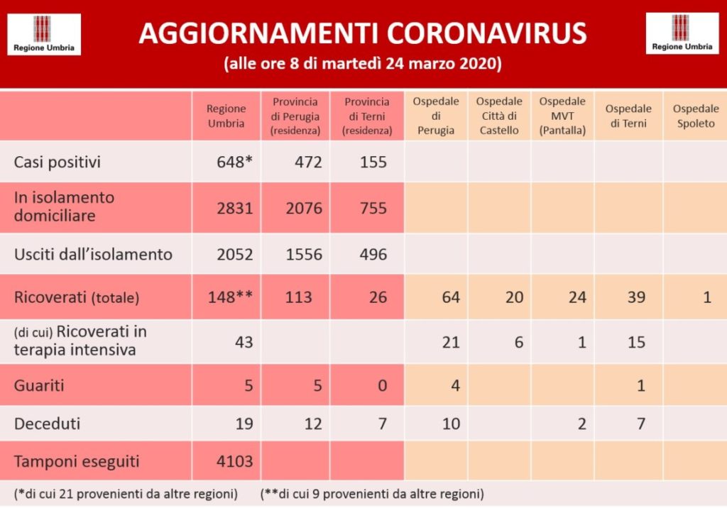 Dai dati aggiornati alle ore 8 di martedì 24 marzo, 648 persone in Umbria risultano positive al virus Covid-19, i guariti sono 5 tutti residenti nella provincia di Perugia, 4 erano in ospedale a Perugia e 1 a Terni. I deceduti sono 19: 12 residenti nella provincia di Perugia e 7 in quella di Terni. Dei 648 pazienti positivi, 21 sono di fuori regione: nella provincia di Perugia i positivi sono 472 e 155 in quella di Terni: sono ricoverati in 148, 113 sono residenti nella provincia di Perugia e 26 in quella di Terni, 9 sono di fuori regione. I ricoveri nell’ospedale di Perugia sono 64, 39 in quello di Terni, 20 a Città di Castello, 24 a Pantalla, 1 a Spoleto.