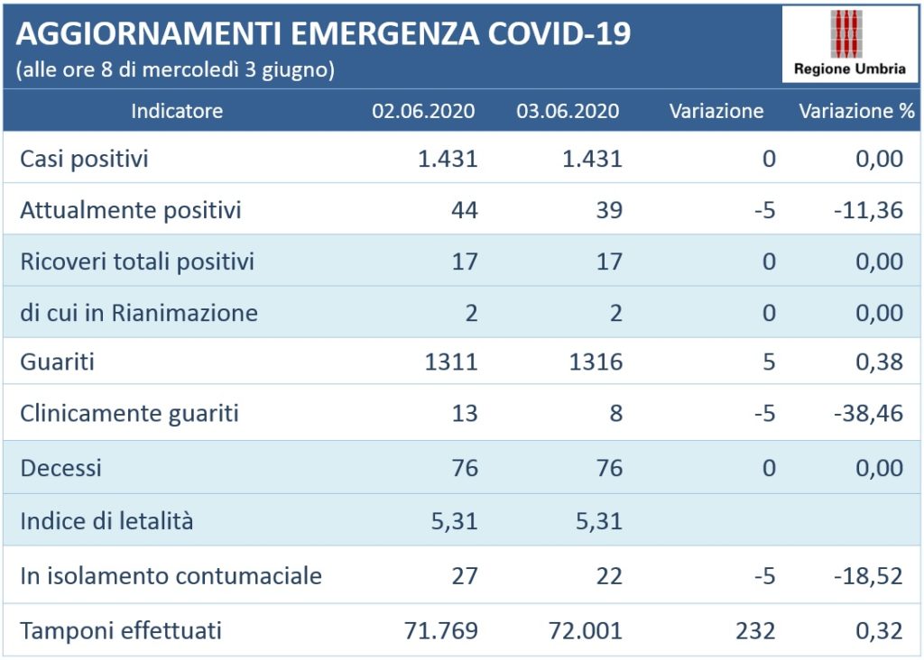 Questi i dati al momento disponibili e aggiornati alle ore 8 di mercoledì 3 giugno: complessivamente 1.431 persone (invariato) in Umbria sono risultate positive al virus Covid-19, gli attualmente positivi sono 39 ( -5). I guariti sono 1316 (+ 5); risultano 8 clinicamente guariti (- 5); i deceduti sono 76 (invariato).