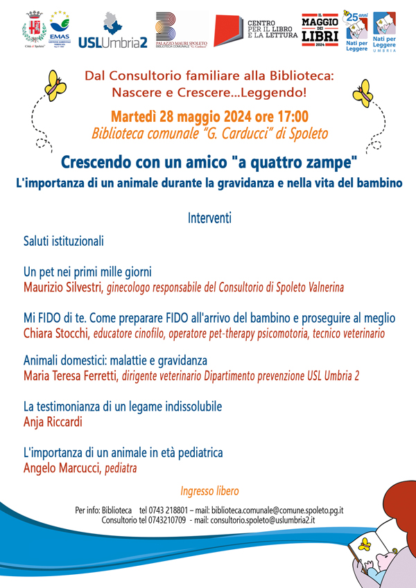 Martedì 28 maggio alle ore 17.00 nella biblioteca comunale di Spoleto, a Palazzo Mauri, si terrà l’incontro informativo ‘Crescendo con un amico ‘a quattro zampe’. L’importanza di un animale durante la gravidanza e nella vita del bambino’.