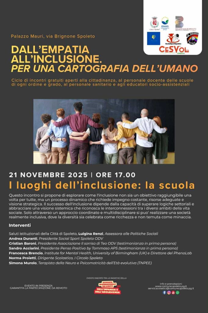 Il 21 Novembre prenderà il via presso Palazzo Mauri un ciclo di incontri mensili dal titolo Dall’empatia all’inclusione. Per una cartografia dell’umano, iniziativa ideata e organizzata dal PhenoLab (referente scientifico del ciclo di incontri) in collaborazione con il Comune di Spoleto, Social Sport Spoleto e Il sorriso di Teo, e patrocinata dal Cesvol (Centro Servizi Volontariato) Umbria.