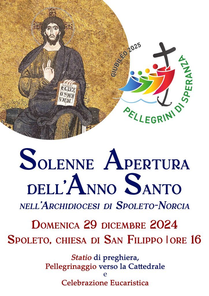 Domenica 29 dicembre 2024 alle ore 16.00 ciai terrà la solenne apertura dell’Anno Santo nell’ Archidiocesi di Spoleto-Norcia. Alle ore 16.00 Arcivescovo, presbiteri e fedeli sono convocati nella chiesa di S. Filippo Neri per la statio di preghiera; poi, ci si avvierà in pellegrinaggio verso la Cattedrale, dove mons. Boccardo presiederà la celebrazione Eucaristica.