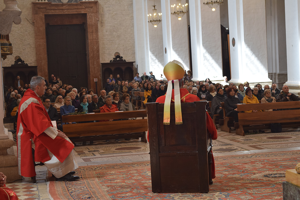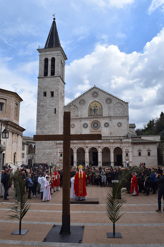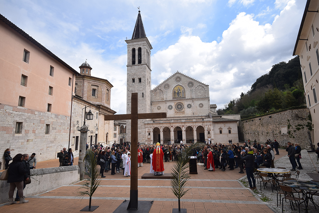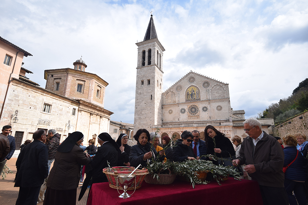 Domenica 14 aprile la Chiesa ha celebrato la Domenica delle Palme, dove si ricorda Gesù entrare deliberatamente e coraggiosamente nella città che sta tramando contro di lui, Gerusalemme. È l’avvio della Settimana Santa, tempo nel quale si rievocano gli ultimi giorni della vita terrena di Cristo e vengono celebrate la sua Passione, Morte e Risurrezione. L’arcivescovo di Spoleto-Norcia e presidente della Conferenza episcopale umbra mons. Renato Boccardo ha presieduto questa celebrazione nella Basilica Cattedrale di Spoleto: in Piazza Duomo ha benedetto i rami di olivo che i numerosi fedeli presenti hanno portato nelle loro case a ricordo della grande lezione di un Dio che si è fatto uomo fino alla morte. La liturgia è stata animata nel canto dalla Cappella Musicale del Duomo, diretta dal maestro Francesco Corrias. Il servizio liturgico è stato curato dai seminaristi della Diocesi.