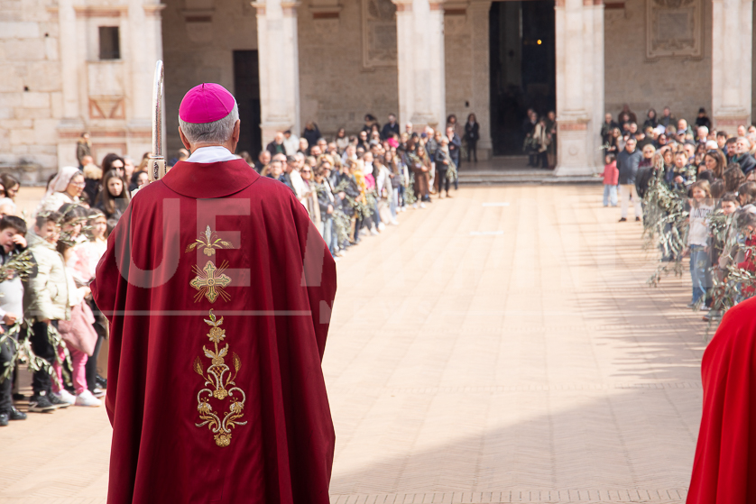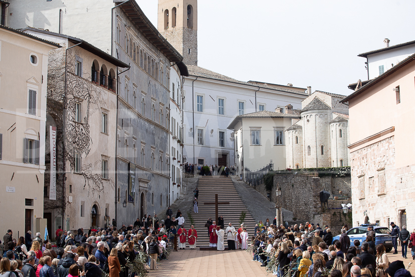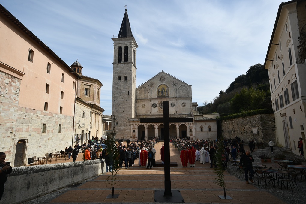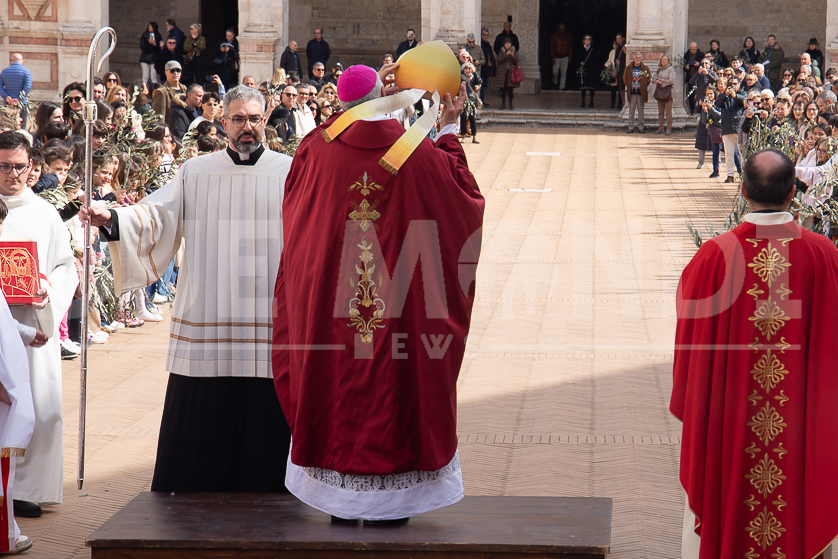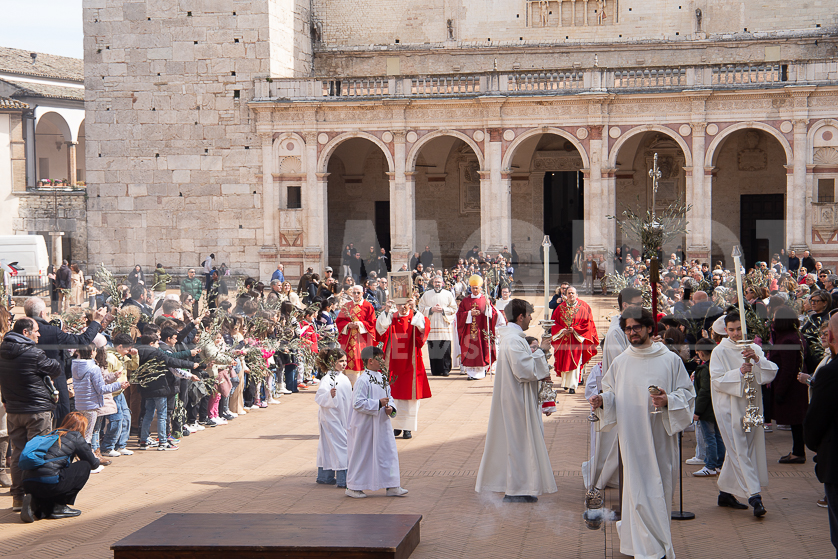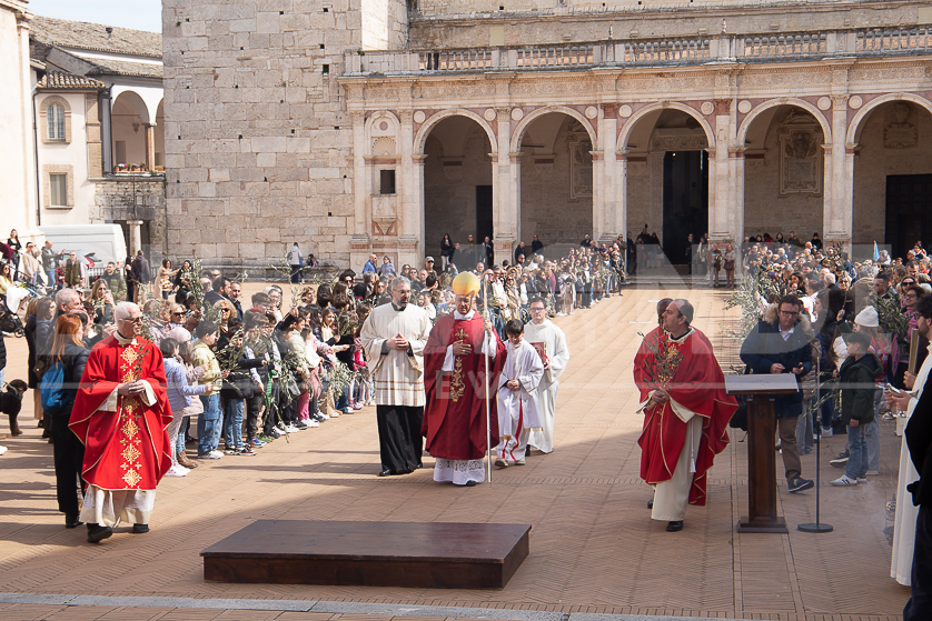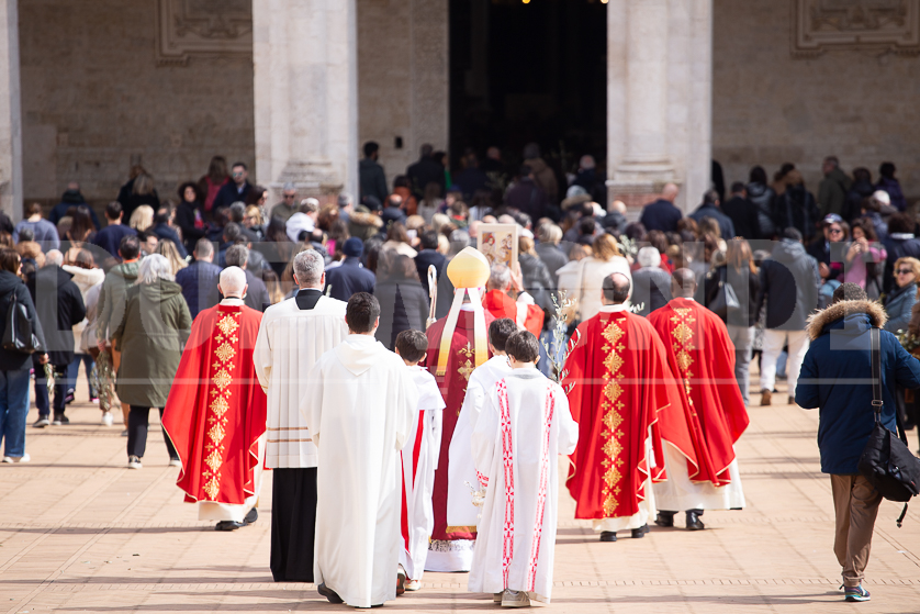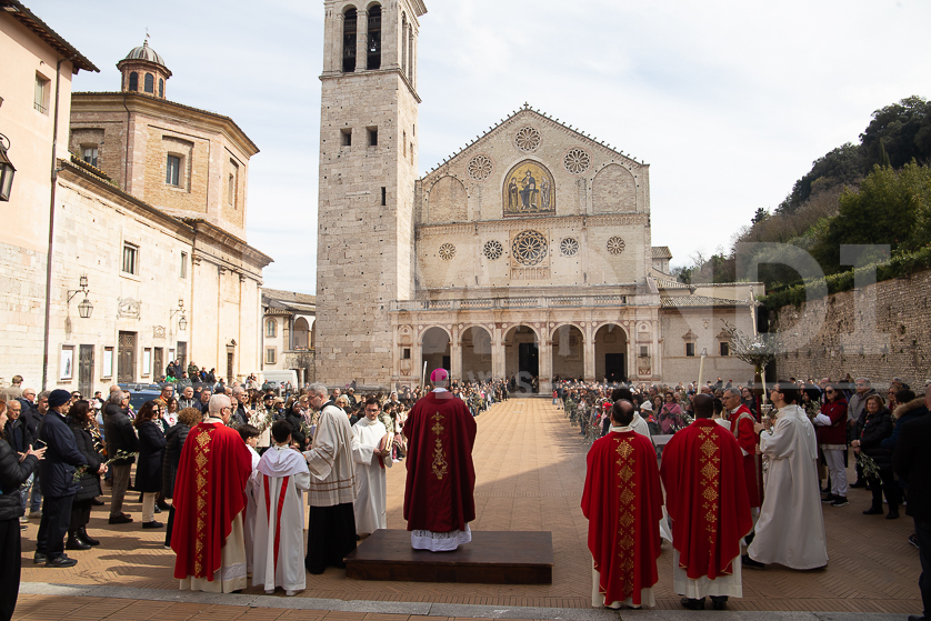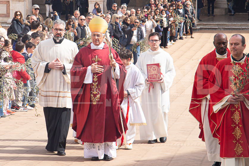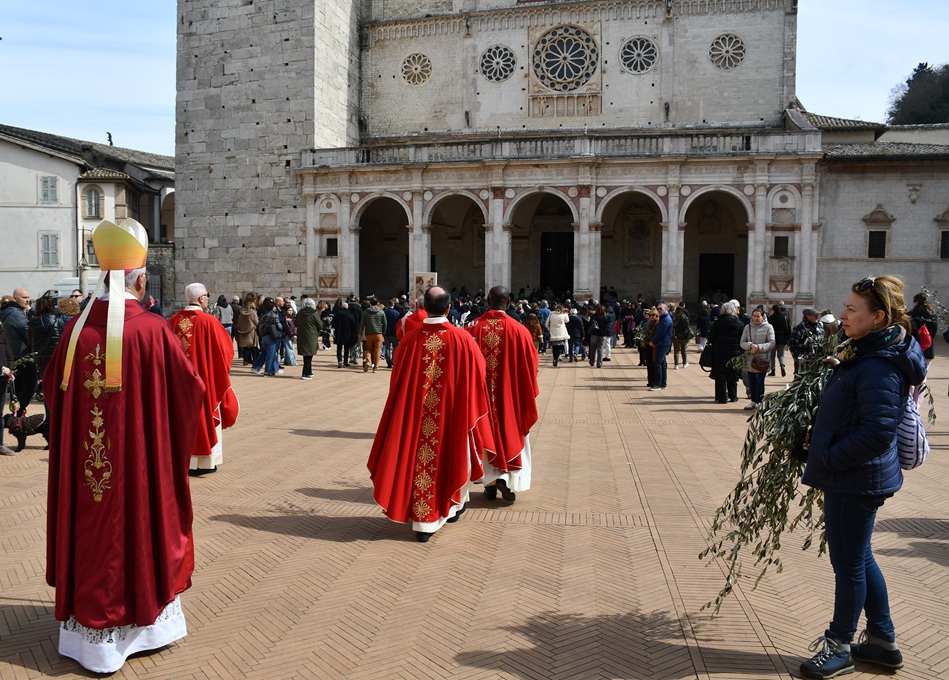 Con la Domenica della Passione, detta anche delle Palme, celebrata il 29 marzo 2026, si entra nella Settimana Santa, tempo durante il quale si contemplano gli ultimi momenti della vita di Gesù. Si ricorda la sua entrata a Gerusalemme, accolto da una folla festante, e quindi la memoria della sua Passione. La Messa è interamente caratterizzata dal tema della passione di Gesù. Nella Basilica Cattedrale di Spoleto è stata presieduta dall’arcivescovo Renato Boccardo insieme ai presbiteri e ai fedeli della Pievania di S. Ponziano, tra cui i bambini e ragazzi della catechesi, che hanno raggiunto il Duomo a piedi dalla chiesa di S. Gregorio. La benedizione dei ramoscelli di ulivo è avvenuta in Piazza e poi c’è stata la processione fin dentro la Cattedrale: “Osanna al figlio di Davide! Benedetto colui che viene nel nome del Signore! Osanna nell’alto dei cieli!”.