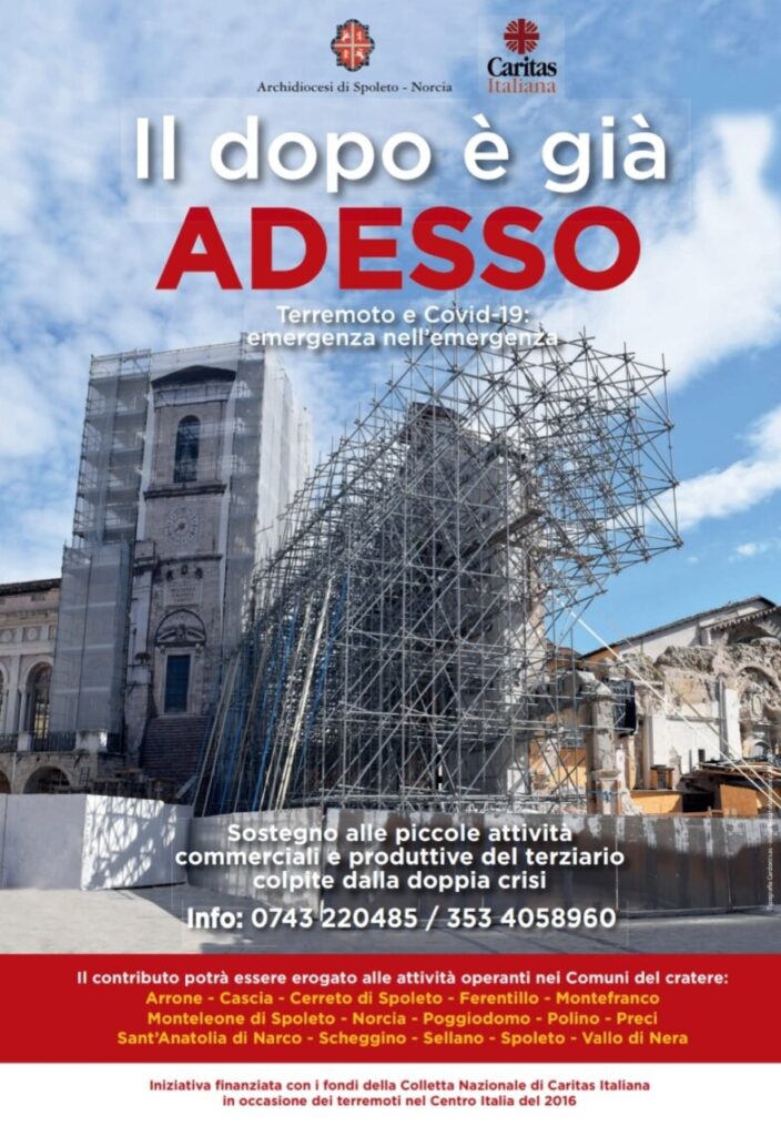Il dopo è già adesso: terremoto e Covid-19, emergenza nell’emergenza. Progetto ai nastri di partenza. È finanziato con i fondi della colletta nazionale che Caritas Italiana organizzò in occasione dei terremoti del Centro Italia del 2016. Alla Caritas di Spoleto-Norcia è stato assegnato un budget di 95.000,00 euro. Tale progetto è stato pensato in riferimento alla doppia emergenza terremoto-Covid-19: nella zona del cratere del sisma, infatti, sono emerse particolari difficoltà delle imprese del settore terziario nel riprendere le attività, con conseguente rischio di riduzione della forza lavoro o addirittura di chiusura. L’iniziativa è pertanto rivolta al settore terziario: bar, ristoranti, piccoli agriturismi, negozi, luoghi di divertimento/intrattenimento, agenzie di viaggio ecc… (a titolo esemplificativo e non esaustivo). Il contributo può arrivare ad un massimo di 5.000,00. Anche qui è necessario fare domanda, presentare la relativa documentazione e un’apposita Commissione vaglierà le richieste. Info presso la Caritas diocesana: 0743 220485; 353 4058960.