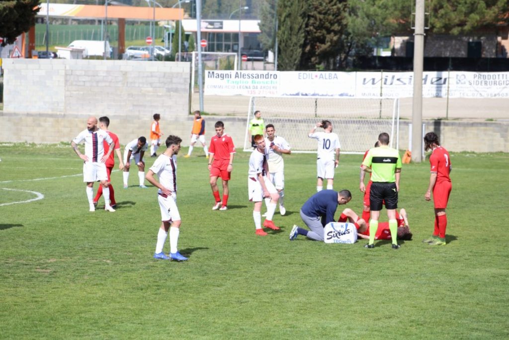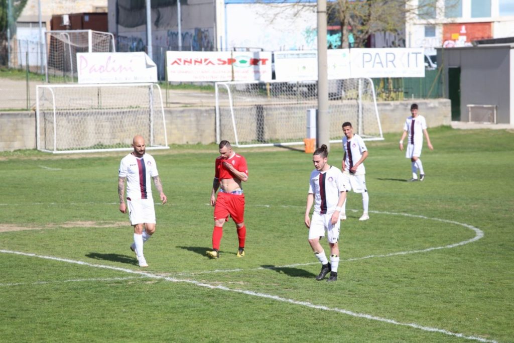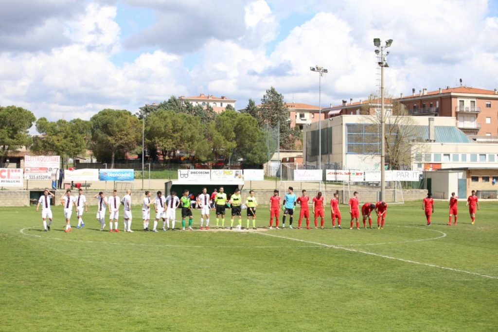 Al 29′ lo Spoleto rimane in inferiorità numerica: Falconieri manda a quel paese il direttore di gara che lo manda anzitempo negli spogliatoi. La gara si fa ancor più in salita per lo Spoleto.