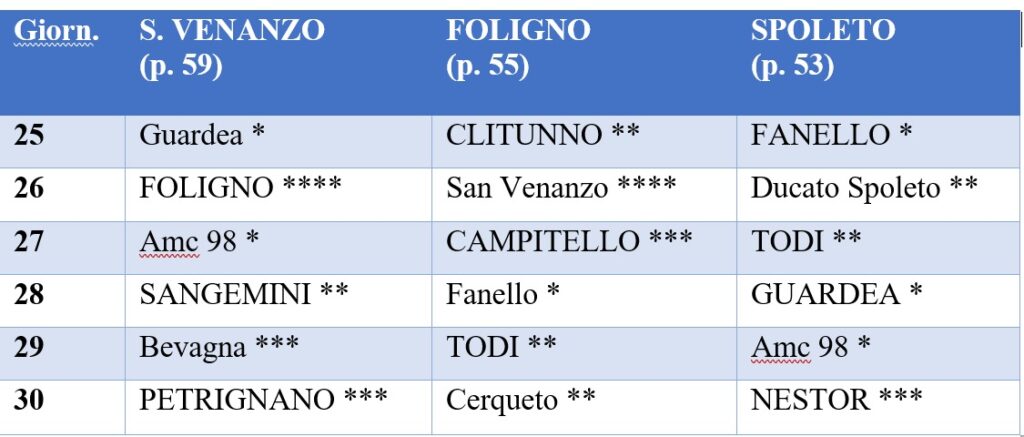 La corsa alla vetta -Teoricamente il calendario più facile lo ha la terza forza del campionato;lo Spoleto. Gli uomini di Cavalli devono provare, male che vada, almeno a riprendersi la seconda piazza per giocare in casa la finale play off con due risultati su tre. Le ultime sei avversarie dei biancorossi sono tutte squadre in lotta per la salvezza e questo non renderà le cose tanto agevoli (in particolare il derby con la Ducato). L’imperativo è rimanere attaccati al treno ed aspettare cosa accadrà nello scontro diretto tra San Venanzo e Foligno. Le due battistrada hanno un calendario tutto sommato simile, ma gli uomini di Montecucco, a stretto giro , giocheranno anche contro Guardea e Amc, mentre il Foligno avrà anche da “sbattere” contro Clitunno e Campitello. Quindi, la sensazione è che le tre prossime giornate daranno un’idea precisa di quello che sarà l’epilogo del campionato. Il resto delle squadre, dal Campitello (41) al Torgiano (35), di fatto rischia di non avere più nulla da chiedere al campionato: solo i ternani e il Bevagna possono provare a ridurre la forbice dal terzo posto per andare a giocarsi la semifinale play off. Vi riusciranno?