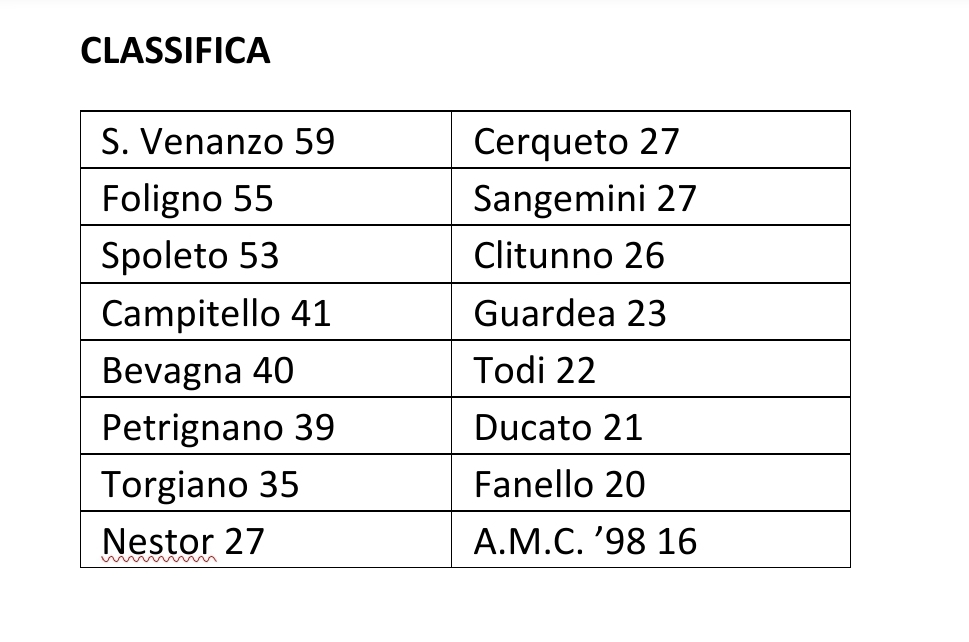 Se alla “Gazzetta” o al “Corriere dello Sport” possono farlo, perché noi no? E allora lanciamo la classica di fine stagione: la tabella per la corsa alla vetta. La situazione è ancora aperta, con una lepre che non riesce a scrollarsi di dosso in maniera definitiva i due levrieri alle calcagna. Il San Venanzo ha 4 punti di vantaggio sul Foligno e 6 sullo Spoleto, ma ancora non è finita: il 23 marzo, quando ci sarà lo scontro diretto al “Pambianco” tra le prime due, molto potrebbe decidersi.