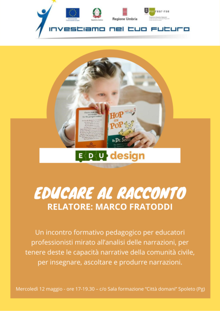 Il primo appuntamento “Educare al racconto” si svolgerà il 12 maggio alle 17 presso la Sala formazione “Città Domani” di Spoleto. L’ incontro formativo pedagogico, riservato ad un target di educatori professionisti, sarà mirato all’analisi delle narrazioni, per tenere deste le capacità narrative della comunità civile, per insegnare, ascoltare e produrre narrazioni e capire come queste influenzino lo sviluppo cognitivo, affettivo ed etico-valoriale dei bambini. Relatore d’eccezione sarà Marco Fratoddi, giornalista professionista e formatore specializzato nelle tematiche ambientali, culturali e educative, direttore del periodico Sapereambiente, insegnante di Scrittura giornalistica al Dipartimento di Lettere e Filosofia dell’Università di Cassino con un corso sulla semiotica della notizia ambientale e le applicazioni giornalistiche dei nuovi media.