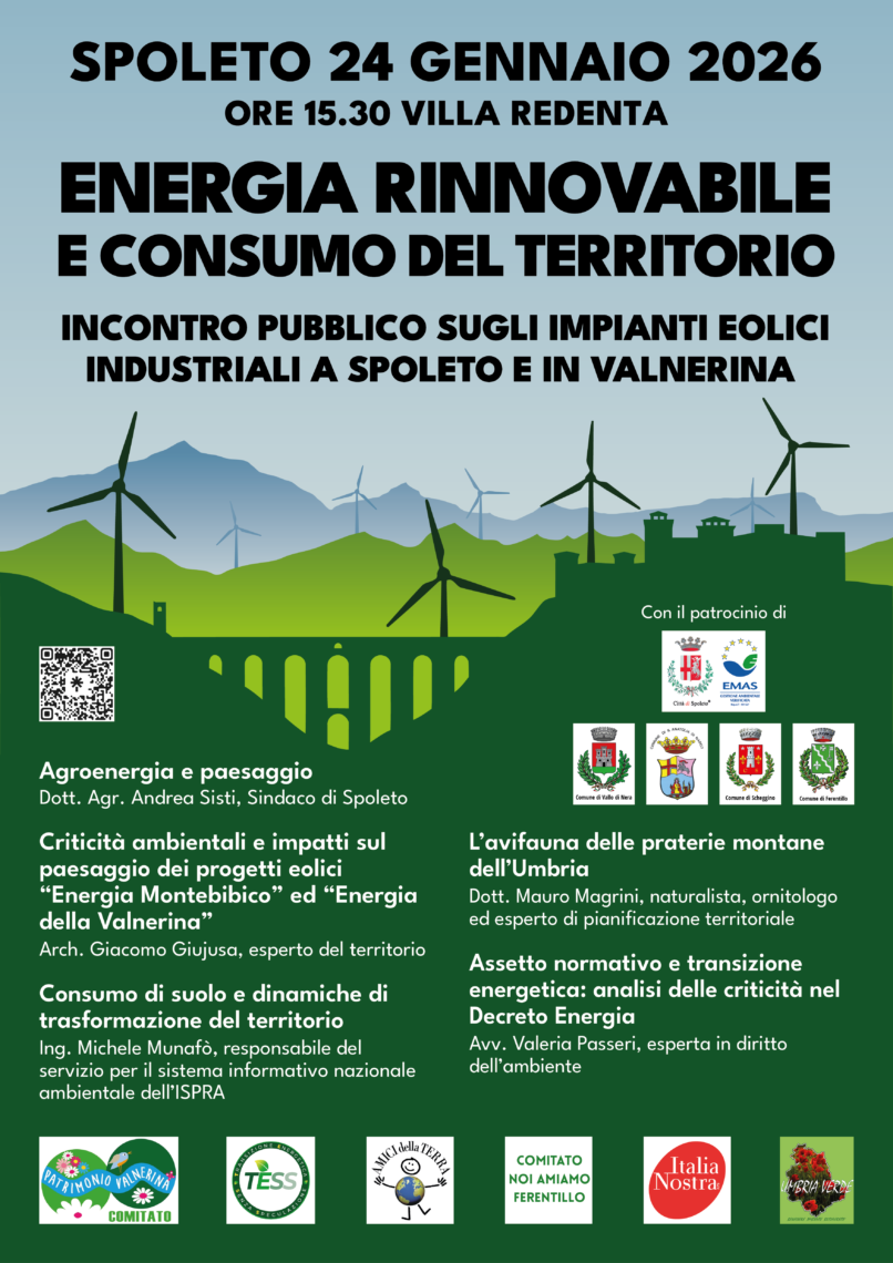 L’assemblea punta ad analizzare le criticità dei progetti “Energia Montebibico” ed “Energia della Valnerina”, valutandone l’impatto ambientale, l’assetto normativo e le conseguenze sul consumo di suolo. Il parterre dei relatori è di alto profilo tecnico e istituzionale: oltre ai saluti e all’intervento del Sindaco di Spoleto, Andrea Sisti, che parlerà di agroenergia e paesaggio, interverranno l’ingegner Michele Munafò (responsabile ISPRA), l’architetto Giacomo Giujusa, l’ornitologo Mauro Magrini e l’avvocato esperto in diritto ambientale Valeria Passeri.
