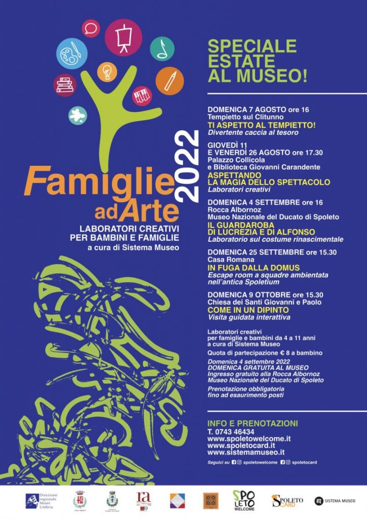 Il progetto, ‘Famiglie ad Arte 2022 – Speciale estate al museo!’, a cura di Sistema Museo in collaborazione con la Direzione Regionale Musei dell’Umbria – Rocca Albornoz – Museo Nazionale del Ducato di Spoleto e Tempietto sul Clitunno, l’Assessorato alla Valorizzazione delle culture, della qualità e della bellezza della Città e del territorio del Comune di Spoleto e il Comune di Campello sul Clitunno, si terrà da domenica 7 agosto a domenica 9 ottobre.