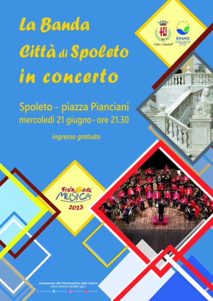 Sempre mercoledì 21 giugno, alle ore 21.30, è invece in programma il concerto della Banda Musicale della Città di Spoleto. L’iniziativa, che sarà a ingresso gratuito, si terrà in piazza Pianciani.