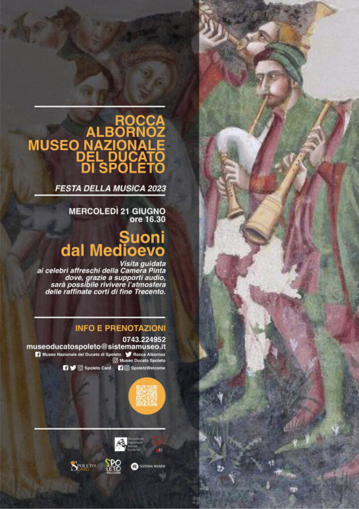 Doppio appuntamento a Spoleto per la Festa della Musica 2023. Mercoledì 21 giugno, Sistema Museo, in collaborazione con il Museo Nazionale del Ducato di Spoleto, propone alle ore 16.30 Suoni dal Medioevo, una speciale visita guidata ai celebri affreschi della Camera Pinta. Qui, grazie a supporti audio, vi ritroverete immersi nell’atmosfera delle raffinate corti di fine Trecento.