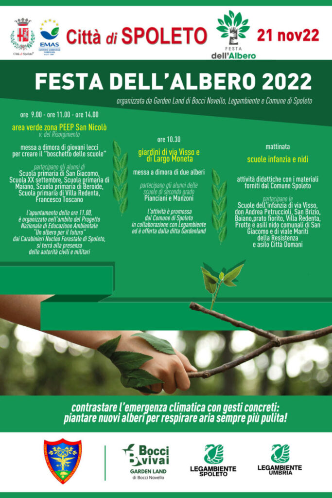 Anche il Comune di Spoleto celebrerà la ‘Festa dell’albero’, un’iniziativa nazionale che attraverso la valorizzazione e la tutela degli ecosistemi, del patrimonio arboreo e dei boschi, promuove l’importanza dei servizi ecosistemici per contrastare le emissioni di CO2 e l’inquinamento dell’aria, prevenire il rischio idrogeologico e conservare la biodiversità e la qualità dei paesaggi.