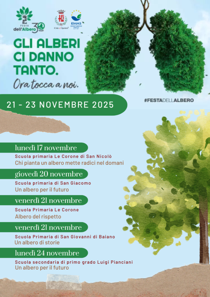 In occasione della Giornata Nazionale dell’Albero 2025, il Comune di Spoleto, in collaborazione con le scuole del territorio e con il supporto di associazioni e istituzioni, promuove una serie di iniziative volte a sensibilizzare le nuove generazioni sull’importanza degli alberi, della biodiversità e del rispetto reciproco e dell’ambiente.