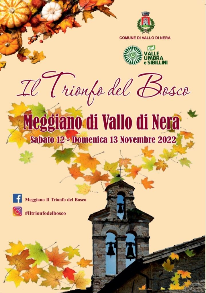 Torna a Meggiano il “Il trionfo del Bosco”, poliedrica iniziativa organizzata dal Comune di Vallo di Nera. La manifestazione, che si pregia del sostegno del Gal Valle Umbra Sibillini e della collaborazione delle proloco di Meggiano e Vallo di Nera – unitamente al supporto dei tanti volontari e delle aziende agrituristiche del territorio – valorizza l’Autunno con i suoi sapori e colori, insieme alle bellezze paesaggistiche, storiche ed enogastronomiche della Valnerina, bellissima valle nel cuore dell’Umbria tratteggiata dal fiume Nera. Uno scenario di grande suggestione, reso ancora più particolare dalle infinite gradazioni di colore delle foglie, tipiche di questo periodo, che trasforma il paesaggio in una grande tavolozza da godere e fotografare.