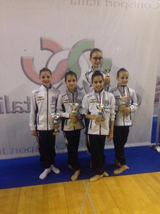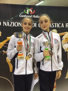 Una pioggia di titoli nazionali ai Campionati Confsport di ginnastica ritmica svoltisi venerdì e sabato a Pesaro, riservato alle ginnaste agoniste. Nella categoria allieve di 1^ Fascia Claudia Cappelletti si aggiudica il primo posto nella gara con la palla con punti 11,10 ed il 3° in quella con il corpo libero con il punteggio di 11,50, nelle stesse gare Estel Peneva Yurieva giunge 5^ in entrambi gli attrezzi rispettivamente con punti 10,50 e 10,80. Soddisfazioni arrivano anche dalle allieve di 2^ Fascia, Camilla Quondam Girolamo giunge 2^ nella gara a corpo libero con punti 11.35 e 3^ alle clavette con punti 12,00, podio anche per Gaia Di Lodovico che con il 10,55 ottenuto al nastro ottiene il 3^ posto, mentre giunge 7^ nella gara con il cerchio. Bella anche la prova di Sara Jane Lipari, 4^ al corpo libero con 10,65 e 7^ alle clavette con punti 10,55. Nelle junior di 1° livello titolo nazionale alla fune per Benedetta Tuzi, con un grande 14,05, mentre al cerchio giunge 10^, fra le 30 ginnaste partecipanti, con punti 11,15. Sul podio anche Benedetta Risi, grazie al 12,95 ottenuto al nastro, ottimo anche il 6° posto alla palla con punti 11,85. Nelle junior di 2° livello brilla Lavinia D’Amato, 2^ al cerchio con punti 13,80 e 3^ alle clavette con 11,45. Ottima la gara di Rebecca Vinti, la ginnasta accompagnata da Svetlana Durdenevskaya, che ottiene il 1^ posto fra le Junior 2^ Fascia, sia alla fune con 15,65 e alle clavette con 14,50.