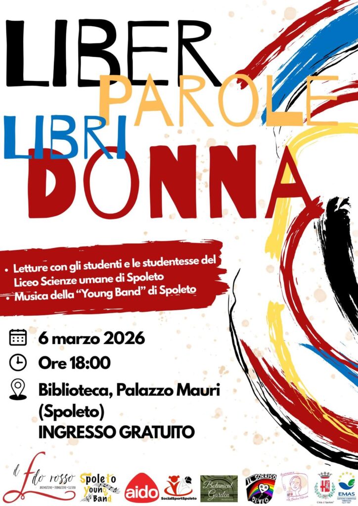 Si comincia venerdì 6 marzo alle ore 18 al Botanical Garden di Palazzo Mauri dove è in programma “Liber, parole libri donna”, evento conclusivo del corso di lettura espressiva svolto con i ragazzi e le ragazze del Liceo Scienze Umane di Spoleto condotto dalla giornalista Elisabetta Proietti. L’iniziativa curata dall’Associazione Il Filo Rosso con il patrocinio del Comune di Spoleto, vedrà la lettura di testi tratti dalle opere di Alda Merini, Pierpaolo Pasolini e Joyce Lussu, con interventi musicali della Young Band di Spoleto.