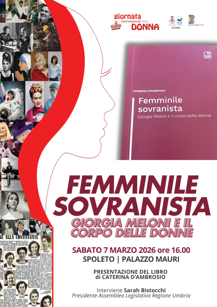 Due le presentazioni di libri a Palazzo Mauri in calendario sabato 7 marzo. Alle ore 16 alla sala del II piano si terrà “Femminile sovranista. Giorgia Meloni e il corpo delle donne” (Tab edizioni) di Caterina D’Ambrosio, nel corso del quale è previsto l’intervento di Sarah Bistocchi, Presidente Assemblea Legislativa Regione Umbria. “Giorgia Meloni è la prima donna a capo del governo italiano in ottant’anni di storia repubblicana. La prima ad aver infranto il soffitto di cristallo. Solo il suo, però. Chi si aspettava che potesse essere il grimaldello per una società più aperta e inclusiva, con un occhio di riguardo per le donne, è rimasto presto deluso. La regola delle tre P (patria, populismo e pena) guida ogni sua scelta. Il suo governo non è né femminile né femminista, anzi, il corpo delle donne è diventato terreno di scontro politico. Questo libro è una fotografia di quanto accaduto sinora e una piccola cassetta degli attrezzi per capire, al di là degli slogan, come sta cambiando il mondo in cui si muovono le donne italiane”.