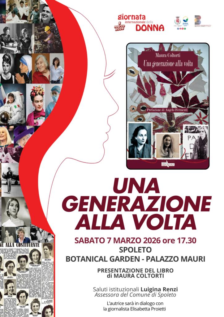 Sempre sabato 7 marzo a Palazzo Mauri, ma nel Botanical Garden e alle ore 17.30, è in programma la presentazione del libro “Una generazione alla volta” (Edizioni Era Nuova APS) di Maura Coltorti. L’incontro, che sarà aperto dal saluto istituzionale dell’assessora del Comune di Spoleto Luigina Renzi, vedrà l’autrice in dialogo con la giornalista Elisabetta Proietti. Nel corso dell’iniziativa si terrà la lettura di brani scelti a cura di Anna Rita Antonelli, Laura Frascarelli e Leonilde Gambetti.