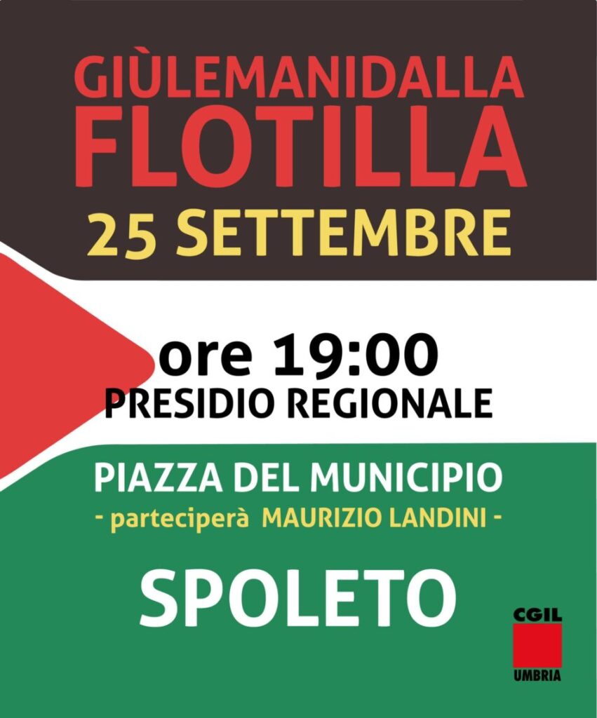 “Gravissimi gli attacchi alla Global Sumud Flotilla in viaggio per consegnare gli aiuti umanitari a Gaza. Domani a Spoleto presidio regionale con Maurizio Landini, pronti allo sciopero generale”. Con questo messaggio la Cgil Umbria ha convocato per giovedì 25 settembre alle 19 un presidio regionale a Spoleto, in piazza del Municipio. Vi interverrà il segretario generale della Cgil Maurizio Landini