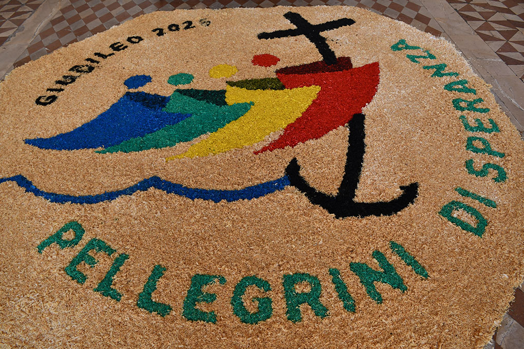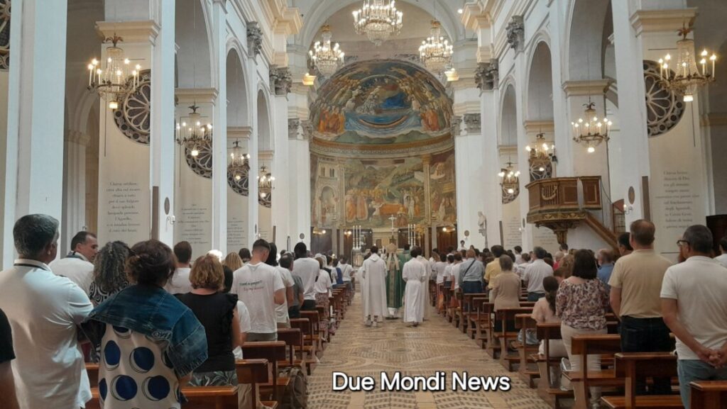“Se sarete quello che dovete essere, metterete fuoco in tutto il mondo”: con questa espressione di Santa Caterina da Siena (cfr Lett. 368), ripresa anche da S. Giovanni Paolo II nel Giubileo dei Giovani del 2000, l’arcivescovo di Spoleto-Norcia mons. Renato Boccardo ha salutato i giovani ospiti a Spoleto, in cammino verso Roma per vivere il Giubileo loro dedicato, al termine della Messa celebrata in Duomo la mattina di domenica 27 luglio 2025. Erano presenti ragazzi e ragazze delle diocesi italiane di Milano, Mondovì e Cuneo-Fossano, e di quelle francesi di Évreux e di Rouen. Con mons. Boccardo hanno concelebrato: mons. Olivier de Cagny, vescovo di Évreux, don Pier Luigi Morlino, responsabile del servizio di pastorale giovanile e vocazionale della Diocesi, e i sacerdoti accompagnatori dei giovani. Una celebrazione in italiano e in francese, animata nel canto dagli stessi giovani. Sotto il portico del Duomo, dinanzi al portone centrale, in segno di benvenuto, è stato realizzato il logo del giubileo con il motto “Pellegrini di speranza”.