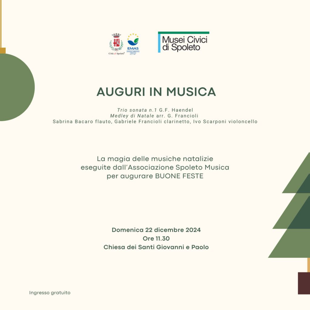 Gli “Auguri in musica” saranno eseguiti da un trio di musicisti dall’Associazione Spoleto Musica composto da Ivo Scarponi (violoncello), Gabriele Francioli (clarinetto) e Sabrina Bacaro (flauto) che eseguiranno un programma di musica classica, impreziosito da composizioni dedicate al Natale.