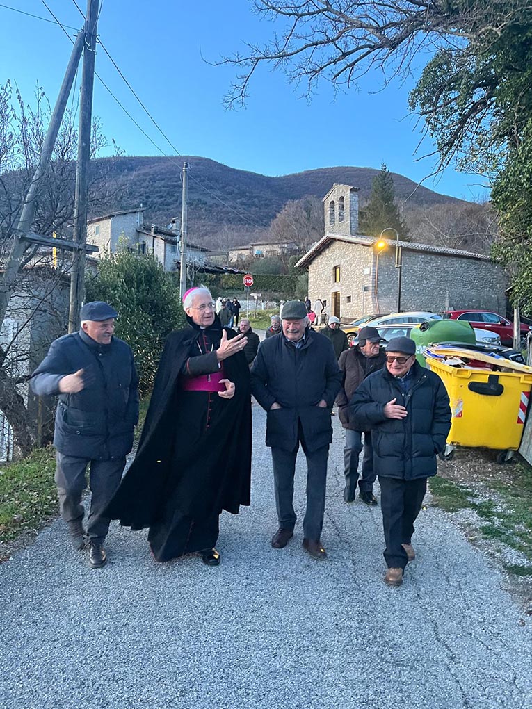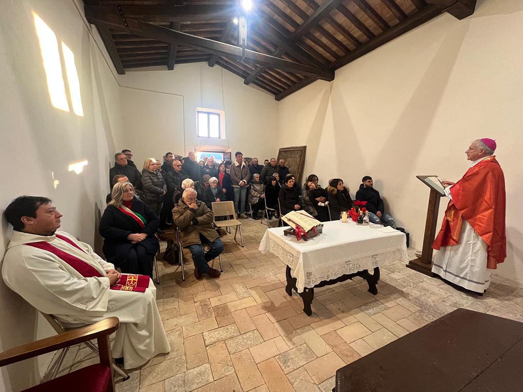 «Anche le comunità più piccole, ai margini della vita frenetica, hanno il loro diritto di esistenza, hanno qualcosa di significativo da dire e da dare a chi vive di corsa. Carissimi amici, abitate in un luogo bellissimo, avete il mondo i vostri piedi, godete dell’armonia del creato. Sappiate che non siete ai margini del cuore della Chiesa diocesana». Con queste parole l’arcivescovo di Spoleto-Norcia mons. Renato Boccardo si è rivolto agli abitanti di Geppa di Vallo di Nera venerdì 26 dicembre 2025 quando ha celebrato la Messa per la riapertura della piccola e deliziosa chiesa di S. Stefano, restaurata dopo i danni dei terremoti del 2016. Nel piccolo borgo stabilmente vivono 9 persone, ma per la storica occasione sono arrivati anche quanti hanno legami vari col paese. La felicità negli abitanti era palpabile, da giorni erano impegnati nel preparare ogni minimo dettaglio, a qualcuno sono scese le lacrime quando sono state nuovamente suonate le campane. «Avere tra noi l’Arcivescovo – ha commentato un signore – è motivo di grande gioia, è grazie a lui se è stato possibile riaprire questa nostra chiesa e lo ringraziamo per aver dedicato un po’ del suo tempo alla nostra piccola comunità di Geppa». Con il Presule hanno concelebrato i sacerdoti della Pievania dei Santi Felice e Mauro, don Luis Vielman e don Sebastiano Devasia Urumbil. La liturgia è stata animata dalla corale della Pievania. Presente il sindaco di Vallo Nera Agnese Benedetti e il confinante di Santa Anatolia di Narco Tullio Fibraroli.