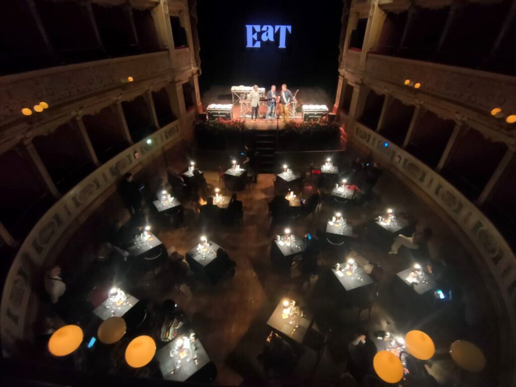 Produzioni indipendenti e innovative, capaci di coinvolgere e stupire, nessuna distanza tra platea e palco, lo spazio del teatro viene condiviso interamente in una chiave di convivialità̀ esperienziale unica. È questo, ma anche molto altro “EaT – Enogastronomia a Teatro”, dove gli spettacoli in programma diventano volano di promozione dei prodotti del territorio in una chiave unica e innovativa. Il concerto che puoi mangiare, lo spettacolo teatrale con cena a base di vino e cinghiale, un grande tavolo dove attori e spettatori si ritrovano a condividere il tempo di un pranzo, la cultura dell’olio e i mille volti del Trebbiano Spoletino sono alcuni degli ingredienti della manifestazione. Ma anche il cooking show Marco Gubbiotti versus Giorgione e il Food Sound System, spettacolo di cucina, musica dal vivo, teatro e video di Donpasta, cuoco, poeta ed ecologista.