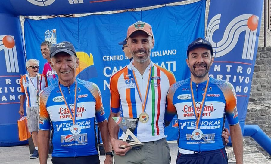 Nelle Marche il team ha dimostrato ancora una volta di avere pochi rivali quando in palio ci sono i titoli italiani del CSI, anche in un format di gara estremamente specifico come quello della Cicloscalata. Format che può definirsi ormai il terreno di caccia preferito di Raffele Cavalli (M4), già capace di imporsi nella rassegna tricolore di specialità nel 2023. A due anni di distanza dall’impresa di Campocatino l’atleta di Rieti ha offerto un ulteriore dimostrazione di forza in questo esercizio, interpretando alla perfezione una prova entrata nel vivo, dopo un tratto “dietro macchina” di 50 km a velocità controllata ma sostenuta, nei 5 km finali di ascesa verso il borgo di Montefalcone Appennino. Un’ascesa degna di una corsa professionistica, con pendenza media vicina al 10%, che Cavalli ha saputo affrontare in costante progressione, senza lasciare scampo agli avversari diretti per il tricolore. Alle sue spalle il compagno Matteo Laureti ha inoltre concretizzato una clamorosa doppietta di categoria, andandosi a prendere la piazza d’onore dopo aver provato con coraggio a forzare i tempi sulle prime rampe della scalata. A completare la festa del Bici Club ci ha quindi pensato il veterano del team Paolo Orazi, che con il 2° posto tra gli M9 ha conquistato la terza medaglia tricolore del 2025.