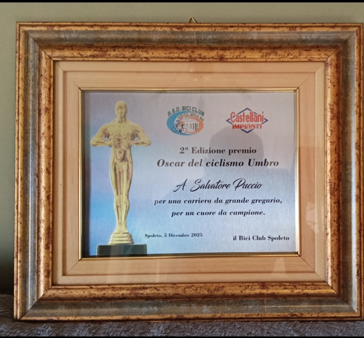 Il riconoscimento ideato dal Bici Club per omaggiare le personalità capaci, nel corso dell’anno solare, di tenere alta la bandiera del pedale umbro in ambito nazionale e internazionale ha toccato quest’anno il mondo del professionismo. La scelta è infatti ricaduta su Salvatore Puccio, corridore nativo della Sicilia ma adottato, ciclisticamente e non solo, dal cuore verde d’Italia e da Assisi, località dove è cresciuto e dove risiede anche oggi. Un premio alla carriera per un corridore che, proprio in questo 2025, ha appeso la bici al chiodo dopo 14 anni di militanza nel World Tour, tutti trascorsi con la compagine britannica della INEOS Grenadiers, conosciuta nella scorsa decade come Team Sky. Nel tempo Puccio si è affermato come uno dei gregari più fidati e apprezzati del plotone, togliendosi anche la soddisfazione di vestire la maglia rosa per una tappa nel Giro d’Italia 2013, al termine della vittoriosa cronosquadre di Ischia. Un esempio il suo di come si possa costruire una brillante percorso nella massima serie del ciclismo mondiale proprio partendo dall’Umbria, dove ha svolto, con le maglie dell’UC Bastia prima e dell’UC Petrignano poi, la trafila delle giovanili dalla categoria Esordienti a quella Juniores.