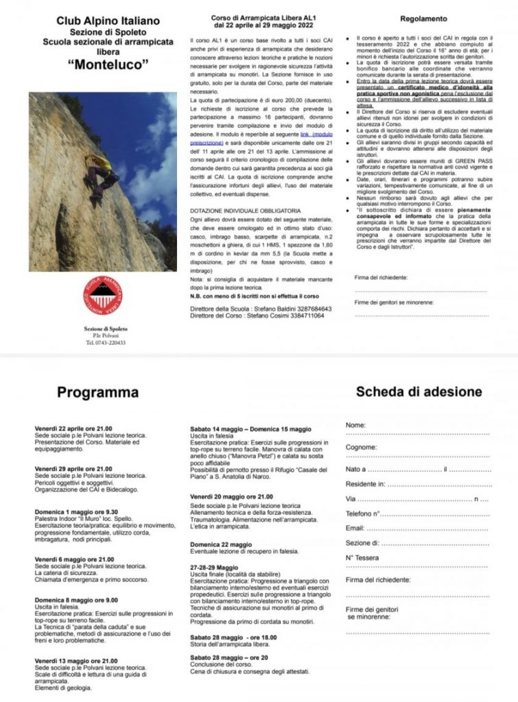 Si inizia venerdì 22 aprile alle 21, nella sede sociale di Piazzale Polvani, con una prima lezione teorica per presentare il corso e distribuire materiale ed equipaggiamento. La settimana successiva, venerdì 29 aprile, sempre alle 21 e sempre presso la sede sociale, l’incontro organizzato dal CAI e Bidecalogo sarà dedicato ai pericoli oggettivi e soggettivi. Appresi i primi rudimenti, domenica 1° maggio alle 9.30 l’appuntamento alla Palestra Indoor “Il Muro” di Spello.