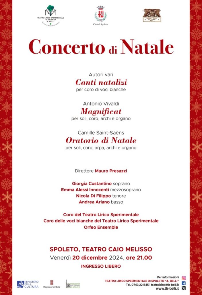 Il Teatro Lirico Sperimentale, in collaborazione con il Comune di Spoleto e l’Associazione Culturale “L’Orfeo”, dedica alla città un Concerto di Natale che si terrà venerdì 20 dicembre 2024 alle ore 21 al Teatro Caio Melisso di Spoleto.