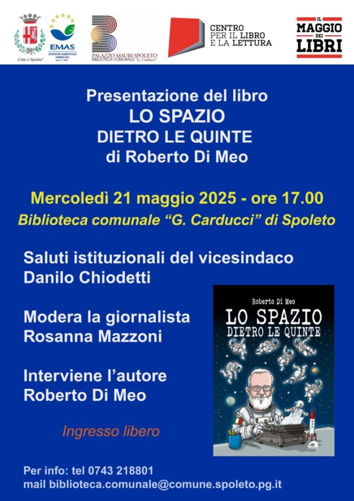 Mercoledì 21 maggio alle ore 17.00 a Palazzo Mauri, sede della Biblioteca comunale ‘G. Carducci’ di Spoleto, si terrà la presentazione del libro ‘Lo Spazio dietro le quinte’ di Roberto Di Meo.