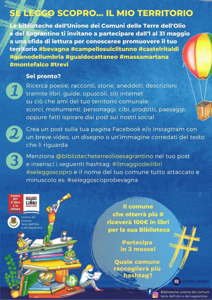 Le 8 biblioteche dell’Unione dei Comuni delle Terre dell’Olio e del Sagrantino invitano tutti a partecipare dall’1 al 31 maggio a una sfida di lettura per conoscere il proprio territorio e promuoverlo nei post facebook e instagram attraverso l’hashtag #seleggoscopro e il nome del proprio comune.
