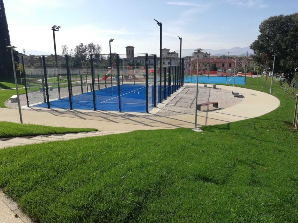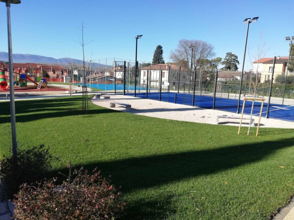 Più nello specifico l’intervento ha consentito la realizzazione di nuove sedute in pietra di travertino, la pavimentazione in masselli, i percorsi pedonali interni e l’area giochi in pavimentazione anti-trauma. Non solo. Insieme alla sistemazione delle alberature e al nuovo sistema di illuminazione pubblica al led, sono stati realizzati un campo di padel (i fari di illuminazione ne garantiranno l’utilizzo anche nelle ore notturne) ed un campo di volley (sfruttabile anche come area polivalente), sono stati istallati nuovi elementi di arredo urbano (panchine e cestini porta rifiuti per la raccolta differenziata) e sono stati realizzati l’impianto di irrigazione e la nuova pavimentazione del parcheggio di via San Marino con la relativa segnaletica orizzontale e verticale.