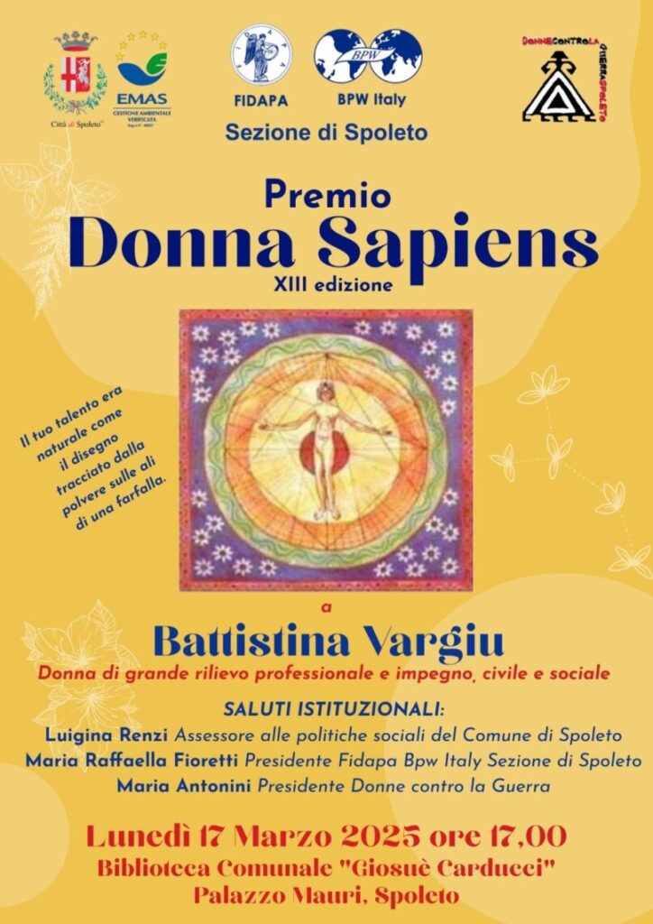 Giunto ormai alla sua 13° edizione, il Premio Donna Sapiens 2025 si conferma come un importante riconoscimento per le donne che si sono distinte nel territorio spoletino e non solo, in ambito culturale, artistico, sociale e professionale.