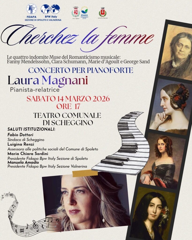 Il secondo evento, “Cherchez la femme” – Concerto per pianoforte con Laura Magnani, è in programma per sabato 14 marzo alle ore 17 al Teatro Comunale di Scheggino. Sarà un concerto per pianoforte con Laura Magnani, pianista e relatrice, dedicato a quattro straordinarie figure femminili del Romanticismo musicale: Fanny Mendelssohn, Clara Schumann, Marie d’Agoult e George Sand.