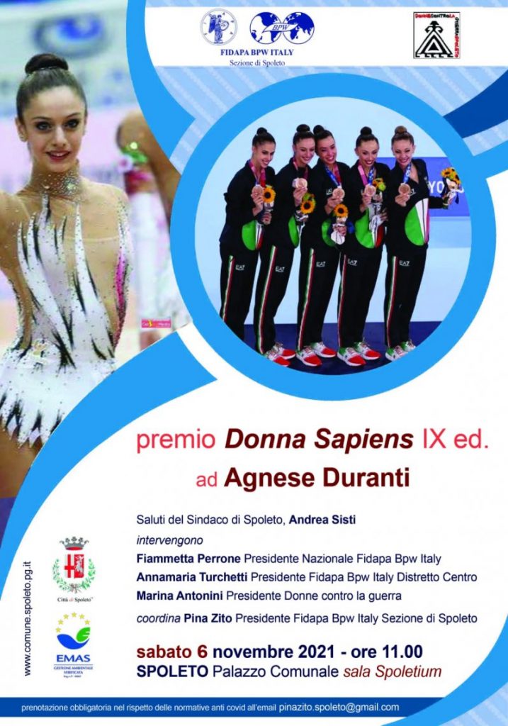 Il premio ‘Donna Sapiens’ sarà assegnato ad Agnese Duranti, atleta della nazionale di ginnastica ritmica vincitrice nel 2021 della medaglia di bronzo ai Giochi olimpici di Tokyo e delle medaglie d’oro e d’argento ai Mondiali di Kitakyushu in Giappone.