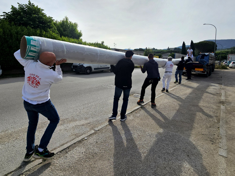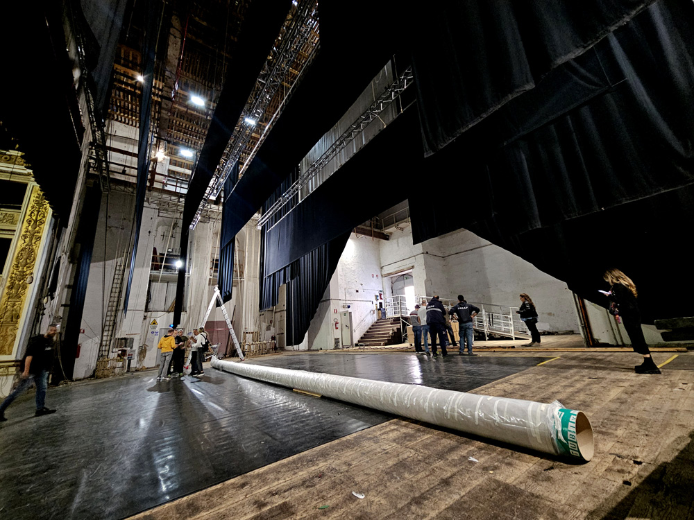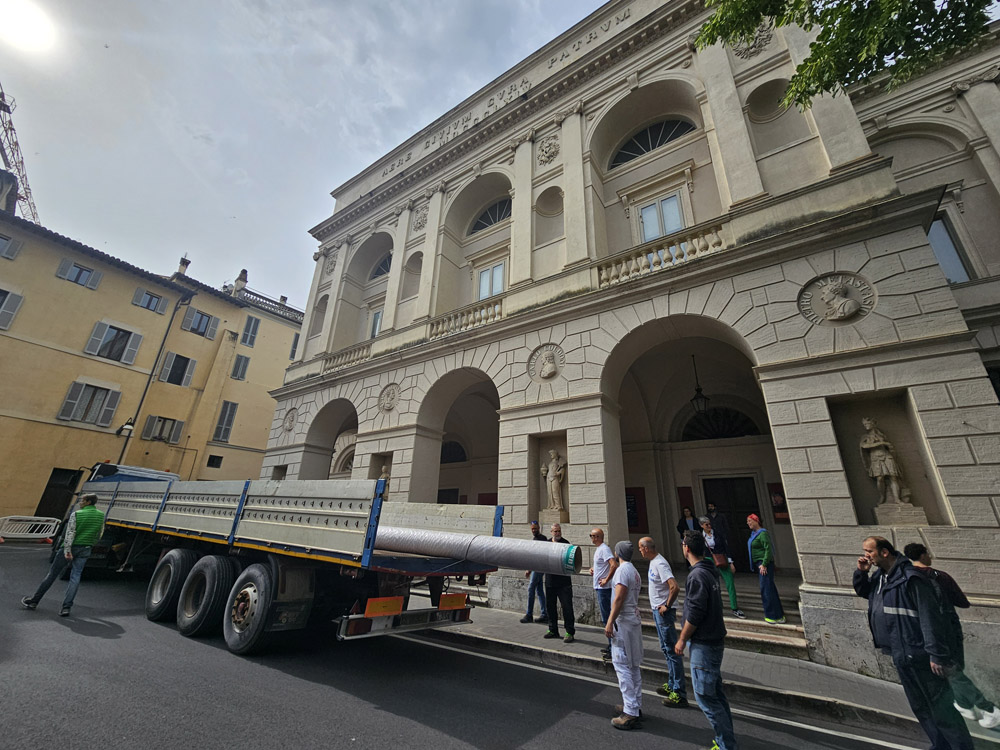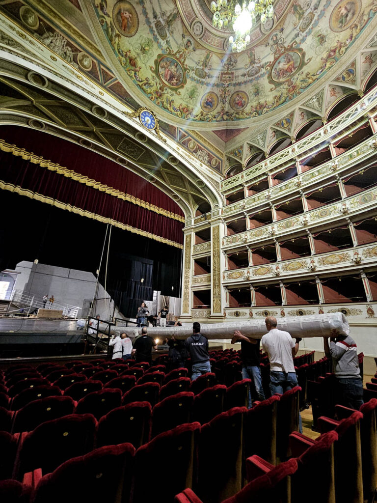 Le operazioni di trasporto, dal laboratorio della Coo.Be.C. a Santo Chiodo dove è avvenuto il restauro al Teatro, si sono svolte questa settimana. Data la maestosità del Sipario Storico (11,90 metri in altezza per 13,92 metri in larghezza) hanno lavorato al trasferimento e alla ricollocazione una decina di persone tra restauratori, personale dell’Ente e attrezzisti.