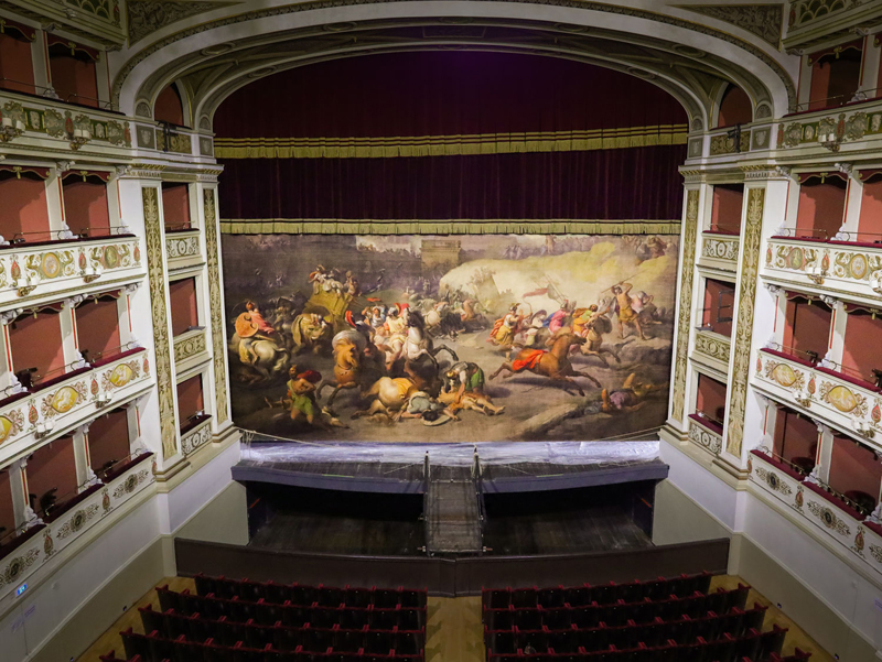 Il Sipario Storico torna dopo 25 anni al Teatro Nuovo Gian Carlo Menotti. Concluso l’imponente restauro effettuato dalla Coo.Be.C. Cooperativa Beni Culturali, grazie alla donazione di AgriEuro srl tramite l’Art Bonus e al cofinanziamento del Comune di Spoleto, la grande tela del maestro Francesco Coghetti realizzata nel 1860 è stata ricollocata nel palcoscenico del Teatro Menotti.