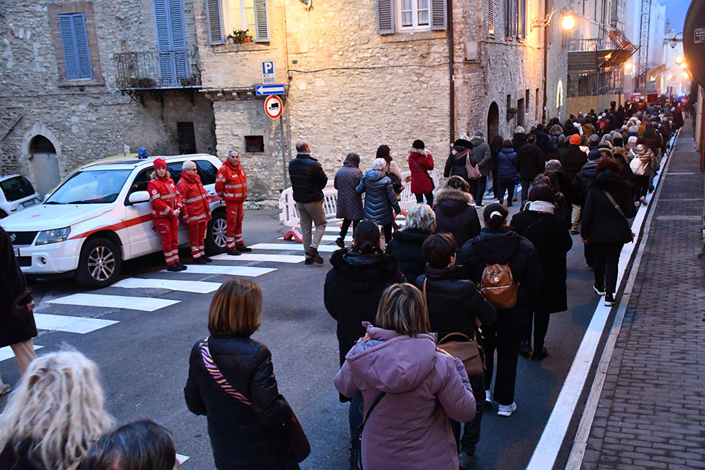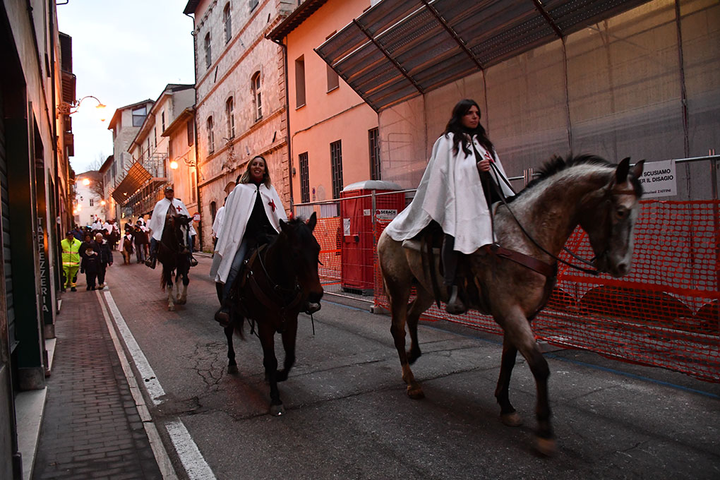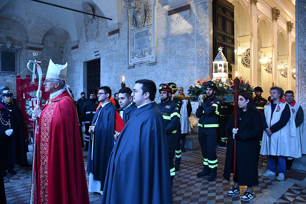 Nel pomeriggio del 14 gennaio 2026 tantissimi spoletini, stringendosi idealmente attorno alla memoria del Santo Patrono Ponziano, hanno sfilato in processione attraverso la Città: è stato un atto di fede e di testimonianza cristiana, con il quale si è domandata la benedizione di Dio sulla vita e sul lavoro. Questo “camminare insieme” seguendo la Croce di Gesù, in raccoglimento ed adeguato contegno esteriore, è stato il segno della condizione di popolo di Dio in cammino verso la Gerusalemme del cielo. La processione, avviata come da tradizione da cavalli e cavalieri (scuole equestri con tanti bambini presenti e privati cittadini), e presieduta dall’arcivescovo Renato Boccardo, si è snodata dopo la celebrazione dei Secondi Vespri in Duomo. Oltre a moltissimi fedeli, c’erano anche autorità civili e militari, tra cui il vice sindaco Danilo Chiodetti e il consigliere regionale Stefano Lisci.