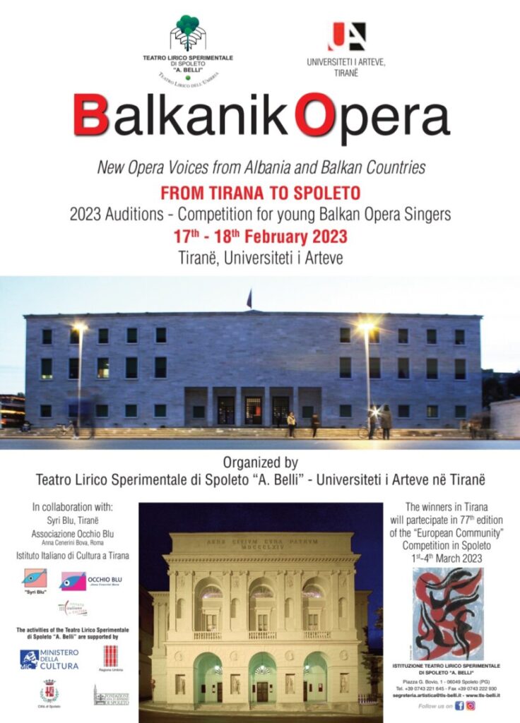 Le Audizioni BALKANIKOPERA© sono frutto della collaborazione tra il Teatro Lirico Sperimentale di Spoleto “A. Belli”, l’Università delle Arti di Tirana, l’Associazione Syri Blue di Tirana, l’Associazione Occhio Blu – Anna Cenerini Bova di Roma patrocinate dall’Istituto Italiano di Cultura a Tirana. Un progetto importante che permette a giovani cantanti lirici albanesi e dei Balcani di potersi mettere alla prova di fronte ad una Commissione di esperti composta da: il celebre soprano Ardita Meni, il celebre tenore Giuseppe Gipali e, in rappresentanza del teatro lirico Sperimentale, il Prof. Gian Carlo Landini, musicologo e critico musicale, il M° Mauro Presazzi, direttore del coro del Teatro Lirico Sperimentale, e la dott.ssa Gloria Bagatti, che si occuperà della segreteria delle audizioni. Le Audizioni si terranno il 17 e 18 febbraio 2023 presso l’Università delle Arti di Tirana, e i tre cantanti che risulteranno idonei avranno l’opportunità di partecipare gratuitamente – grazie al contributo economico di un mecenate sostenitore del Teatro Lirico Sperimentale – al 77mo Concorso “Comunità Europea” per giovani cantanti lirici.