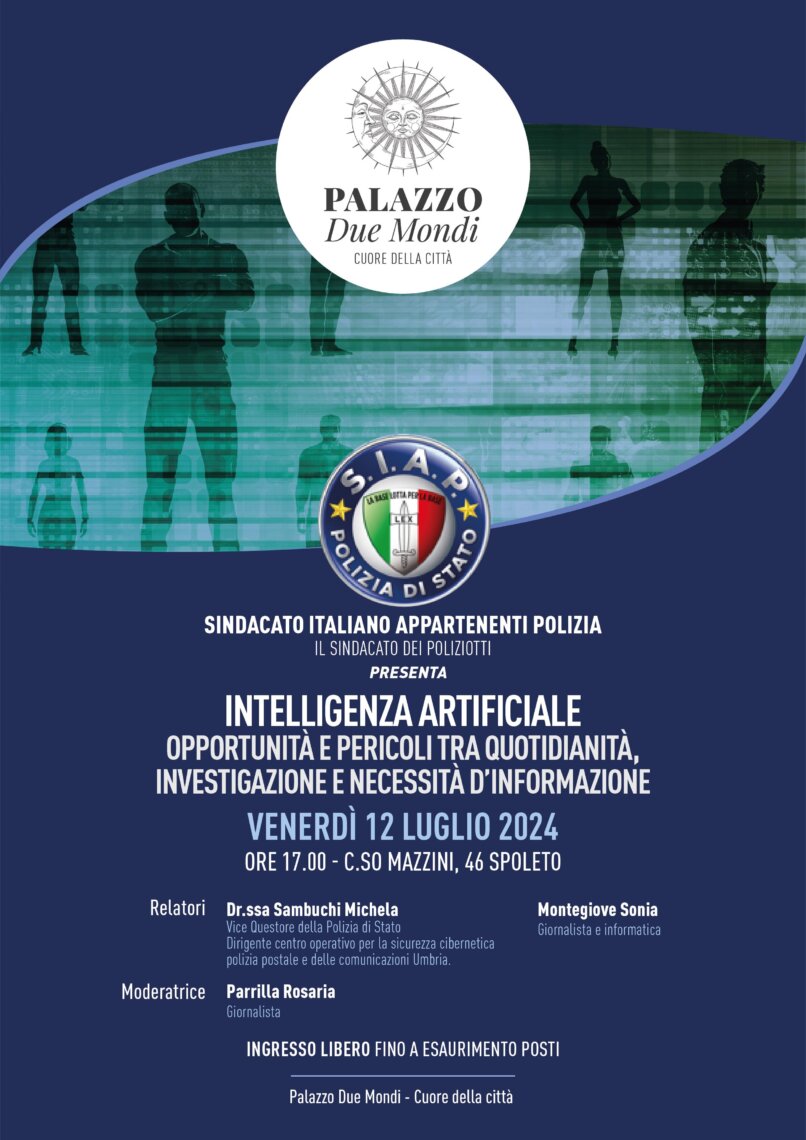 “Intelligenza artificiale – Opportunità e pericoli tra quotidianità, investigazione e necessità di informazione”. È questo il titolo dell’incontro promosso dal Siap (Sindacato italiano appartenenti polizia) Umbria, che si terrà venerdì 12 luglio, alle ore 17, nelle sale di Palazzo Due mondi, a Spoleto.