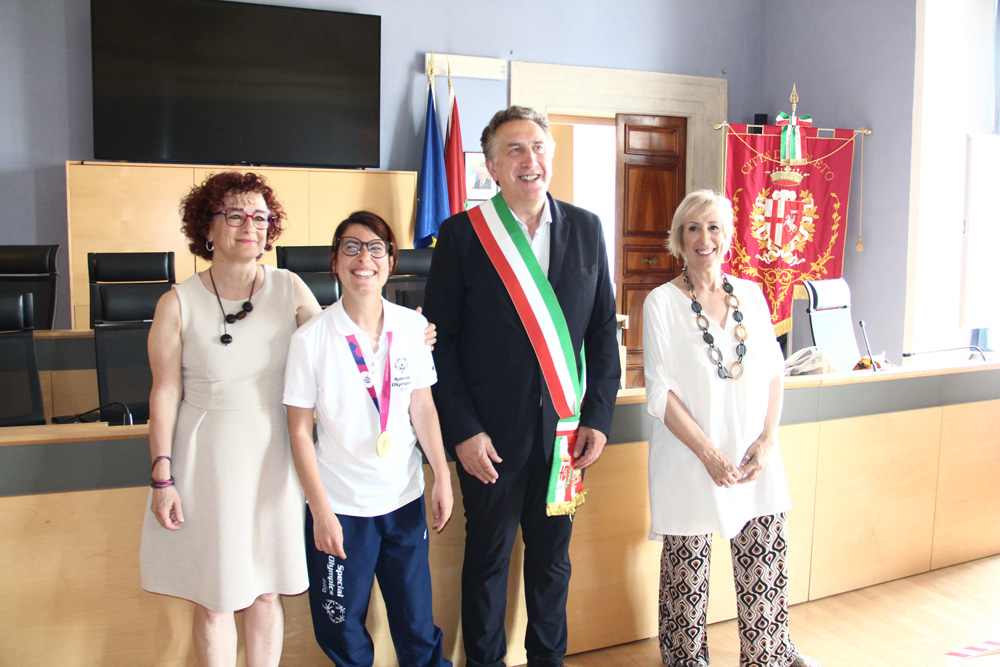 Vincitrice della medaglia d’oro nei 100 metri piani ai Giochi Mondiali Special Olympics di Berlino, Irene Orazi è stata ricevuta questa mattina a Palazzo comunale dal sindaco Andrea Sisti, dagli assessore Luigina Renzi e Giovanni Angelini Paroli, dalla vice presidente del Consiglio comunale Maura Coltorti e dai consiglieri comunali Enrico Morganti e Diego Catanossi.