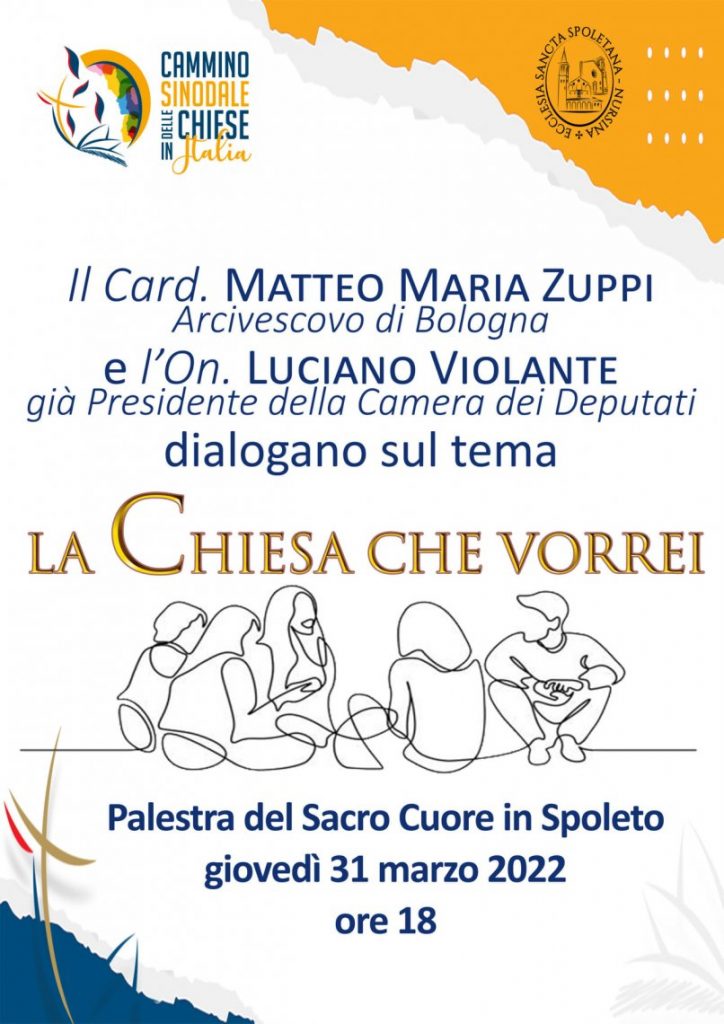 Giovedì 31 marzo 2022 alle ore 18.00 presso la parrocchia del Sacro Cuore in Spoleto si terrà il convegno sul tema “La Chiesa che vorrei” promosso dall’Archidiocesi all’interno del Cammino Sinodale delle Chiese in Italia. Porteranno il loro contributo: il card. Matteo Maria Zuppi arcivescovo di Bologna e l’on. Luciano Violante già presidente della Camera dei Deputati. Modererà Fabio Bolzetta giornalista di TV 2000 e presidente di WeCa (associazione dei Webmaster cattolici).