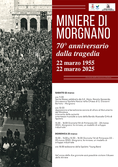 Sabato 22 e domenica 23 marzo l’associazione “Amici delle miniere”, in collaborazione con il Comune di Spoleto, commemora con una serie iniziative il 70° anniversario del tragico evento che il 22 marzo del 1955 costò la vita a ventitré minatori.