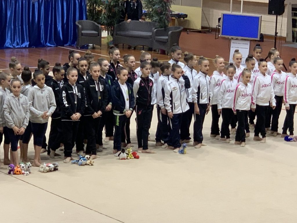 Le ginnaste, iniziando dalla gara Gold 2, (Ginevra Baldassini, Angelica Roccetti, Alice Valentini, Agnese Lovecchio) hanno fatto una buona prova, iniziando in sordina il collettivo a corpo libero, 10,250 il punteggio, qualche indecisione nell’esercizio in successione con palla e nastro, che ha ottenuto punti 8,80, decisamente meglio invece nella gara di coppia con il cerchio, con un positivo 11,00 per concludere con un 9,550 nell’individuale alle clavette, chiudendo la gara al 4° posto con il totale di 39,600 sufficiente per raggiungere le finali nazionali previste a Forlì il 27/28 aprile, il podio ha visto prevalere l’Armonia d’Abruzzo, davanti alla Ginnastica Fabriano e alla Fortebraccio Perugia.